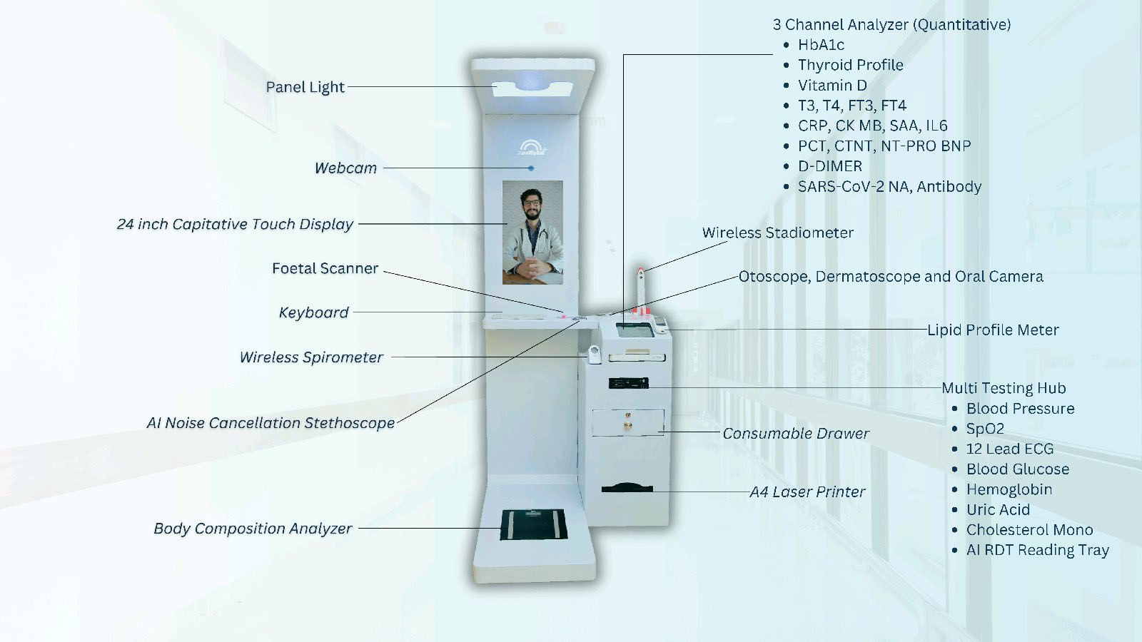 Our Health ATMs are equipped with advanced medical devices and AI-powered software that allow users to check vital health parameters such as blood pressure, blood glucose, BMI, oxygen levels, temperature, and more—all in just a few minutes. Some models also support telemedicine consultations with licensed doctors, enabling real-time health assessments without the need for traditional clinics or hospitals.